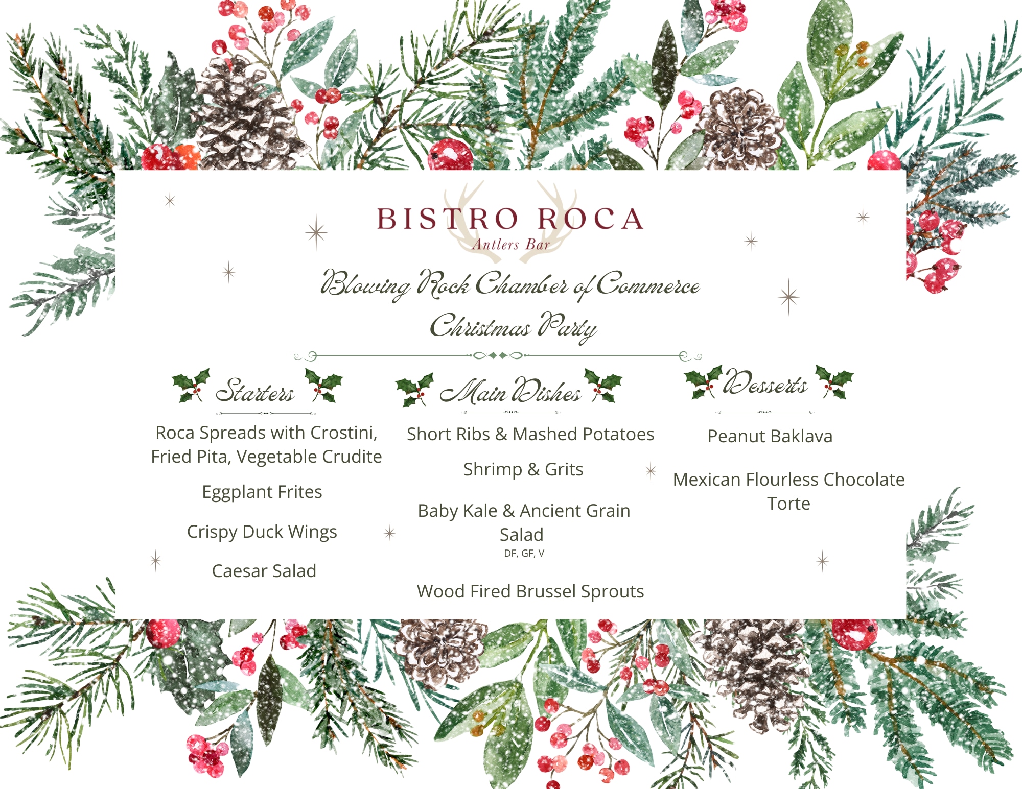 Celebrate the season with us in the cozy charm of Bistro Roca! Enjoy an evening of festive cheer, delicious bites, and great company as we toast to the holidays in true Blowing Rock style.